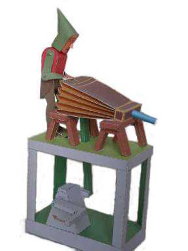 Die Drehbewegung der Kurbel wird durch ein Gestänge in die Auf- und Abbewegung des Blasebalgs und der Arme des Bergmanns umgewandelt.