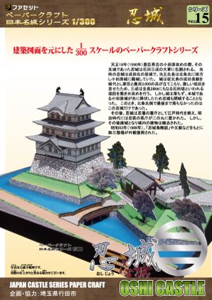 Die Burg Oshi ist bekannt dafür, einem Wasserangriff von Ishida Mitsunari während Toyotomi Hideyoshis Eroberung von Odawara standgehalten zu haben und dennoch nicht gefallen zu sein. In der Edo-Zeit wurde ein dreistöckiger Turm hinzugefügt, der als Verwaltungszentrum für den Oshi-Clan diente. Shigeru Ishihara hat diese prächtige Burg in seiner Serie japanischer Denkmäler im Maßstab 1:300 nachgebildet.