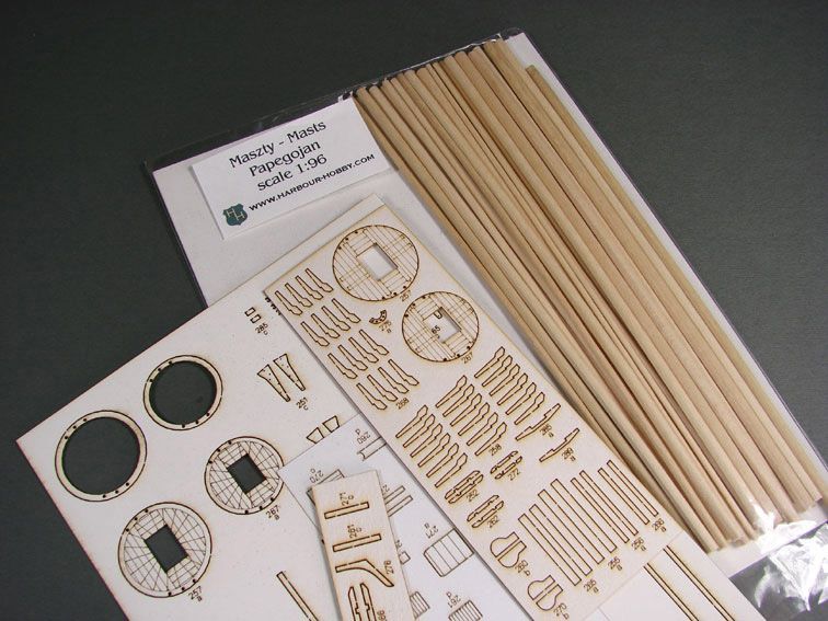 Lasercutsatz und Holzmasten mit verschiedenen Durchmessern für die Papegojan von Shipyard.