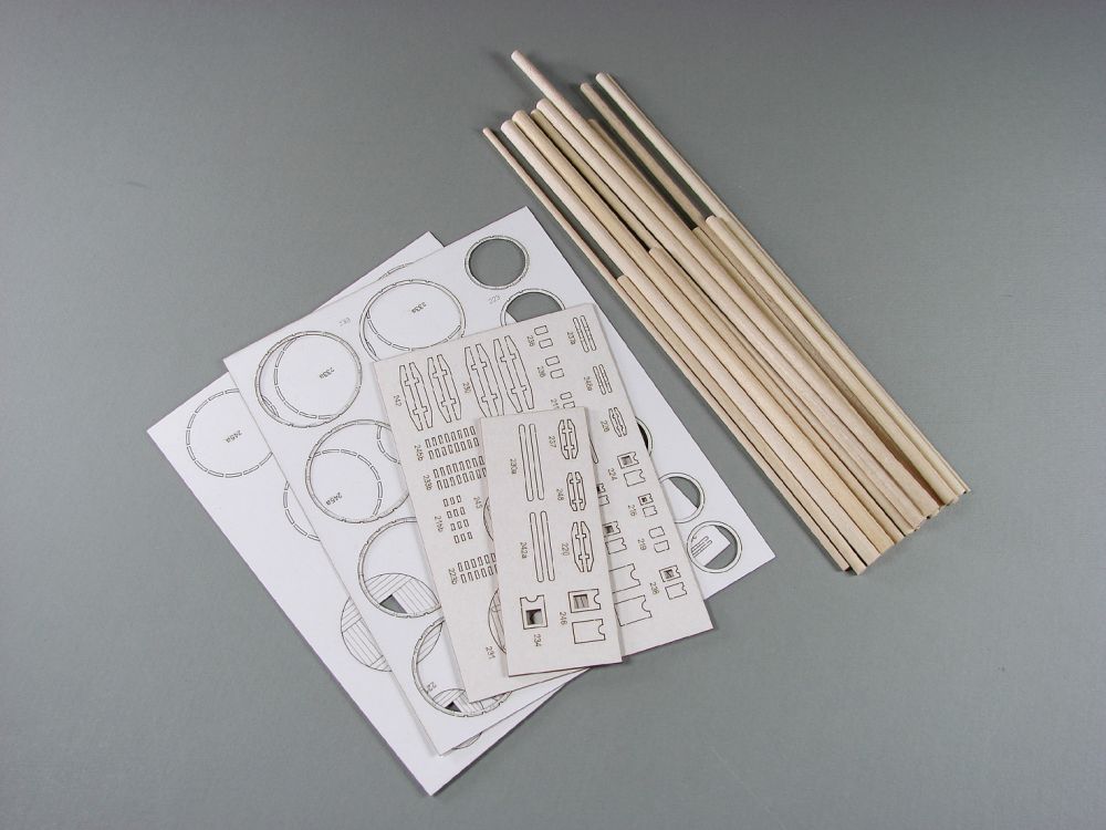 Lasercutsatz und Holzmasten mit verschiedenen Durchmessern für die Revenge von Shipyard.