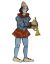 Er ist ein trompetender Pierrot. Er bewegt seine Beine und hebt die Trompete an den Mund.