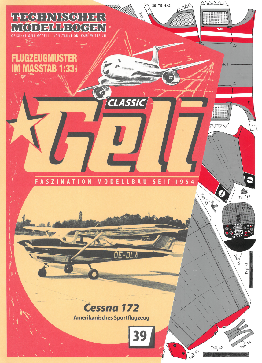 GELI-Originalmodell in traditioneller Produktionsweise hergestellt. Inklusive Zelluloid 7x10 cm für die Cockpitverglasung. Spanten auf 500 g Graufeinkarton gedruckt.