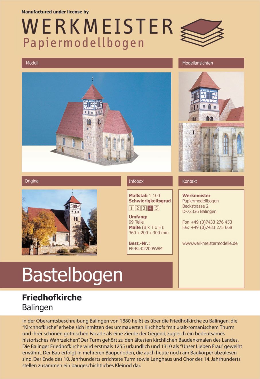 In der Oberamtsbeschreibung Balingen von 1880 heißt es über die Friedhofkirche zu Balingen, die “Kirchhofkirche” erhebe sich inmitten des ummauerten Kirchhofs “mit uralt-romanischem Thurm und ihrer schönen gothischen Facade als eine Zierde der Gegend, zugleich ein bedeutsames historisches Wahrzeichen”. Der Turm gehört zu den ältesten kirchlichen Baudenkmalen des Landes. Die Balinger Friedhofkirche wird erstmals 1255 urkundlich und 1310 als “Unser Lieben Frau” geweiht erwähnt. Der Bau erfolgt in mehreren Bauperioden, die auch heute noch am Baukörper abzulesen sind. Der Ende des 10. Jahrhunderts errichtete Turm sowie Langhaus und Chor des 14. Jahrhunderts stellen zusammen ein baugeschichtliches Kleinod dar.