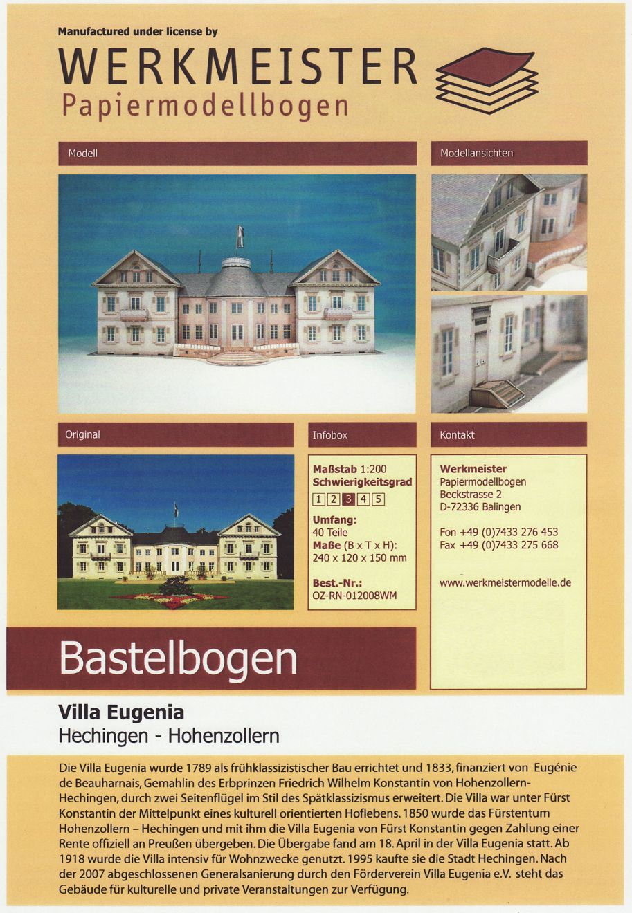 Die Villa Eugenia wurde 1789 als frühklassizistischer Bau errichtet. 1833 wurde sie, finanziert von Eugénie de Beauharnais, Gemahlin des Erbprinzen Friedrich Wilhelm von Hohenzollern- Hechingen, durch zwei Seitenflügel im Stil des Spätklassizismus erweitert. Die Villa war unter Fürst Konstantin der Mittelpunkt eines kulturell orientierten Hoflebens. 1850 wurde das Fürstentum Hohenzollern– Hechingen und mit ihm die Villa Eugenia von Fürst Konstantin gegen Zahlung einer Rente offiziell an Preußen übergeben. Die Übergabe fand am 18. April in der Villa Eugenia statt. Ab 1918 wurde die Villa intensiv für Wohnzwecke genutzt. 1995 kaufte sie die Stadt Hechingen. Seit 2007 steht das Gebäude für kulturelle und private Veranstaltungen zur Verfügung.