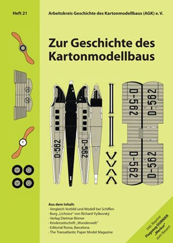 Inhaltsverzeichnis AGK Heft 21:- Wolfgang Holzinger: Unterschiedliche Maßstäbe am selben ModellÜbereinstimmung von Vorbild und Modell bei Modellbaubogen von Schiffen von 1910 bis 1945, Teil 1 1910–1920- Jens Pielawa: Von der Ruine zum KartonmodellLichtenburg: Rekonstruktion einer Burg als Kartonmodell- Bernd Kothera: Verlag Dietmar BörnerIm Gedenken an Dr. Dietmar Börner (1945–2020) - Verleger, Konstrukteur und Drucker- Werner Grieshofer und Dr. Erich Hofmann: Eine „Wunderwelt“ aus WienDie Kinderzeitung „Wunderwelt“ und ihre Bastel- und Modellbaubogen 1948–1986- Francesc d''Assis López Sala und Marga Lozano Crespo: Editorial Roma, BarcelonaEditorial Roma (1939–1987), Teil 1 1939–1952- Axel Huppers: Eine transatlantische VerbindungEin weiterer Pionier der digitalen Kommunikationsmedien - Zur Geschichte der virtuellen Kartonmodellzeitschrift „The Transatlantic Paper Model Magazine“- Axel Huppers: Zur Modellbaubogenbeilage Dornier "Merkur"Schreibers Technische Modellierbogen Nr. 733 Flugzeug DORNIER „Merkur“ (Deutsches Verkehrsflugzeug), Eugen Blumentritt. Original: Bogen 36 × 43 cm, Mst. 1:40, 1932. Reprint: Bogen 18 × 21,5 cm, Mst. 1:120, 2021