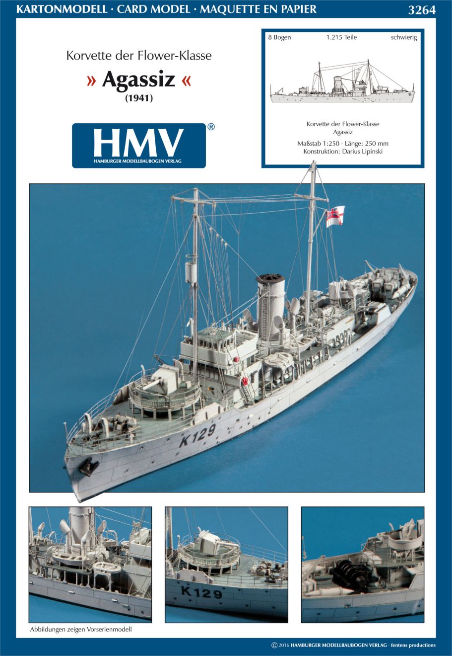 Darius Lipinski hatte dieses Modell der Flower Class Corvette Agassiz bereits einige Jahre vor dem Zusammentreffen mit dem HMV konstruiert. Für eine Veröffentlichung in HMV Qualität hat er das Modell noch einmal komplett überarbeitet und auf einen neuen Stand gebracht. Der Bogen besticht durch seine hohe Detailierung, intelligenten Konstruktionslösungen und natürlich durch den Spaß beim Bau, den man bei der kleinen Korvette ganz sicher haben wird.