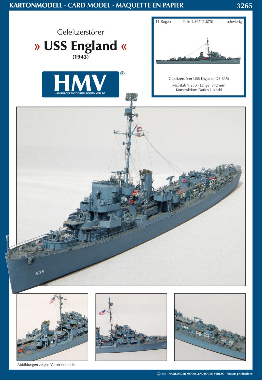 USS England ist einer von 102 Geleitzerstörern der Buckley Klasse. Diese "kleinen" Zerstörer wurden im zweiten Weltkrieg als Geleitschutz für Konvois eingesetzt und vorwiegend zur U-Boot-Jagd und zur Flugabwehr eingesetzt. 46 dieser Einheiten wurden an die Royal Navy abgeliefert. Dort waren sie als Fregatten klassifiziert und liefen als Captain Class. Der Namensgeber der USS England war Ensign John C. England (1920-1941), der sein Leben an Bord des Schlachtschiffs Oklahoma während des japanischen Angriffs auf Pearl Harbor verlor.