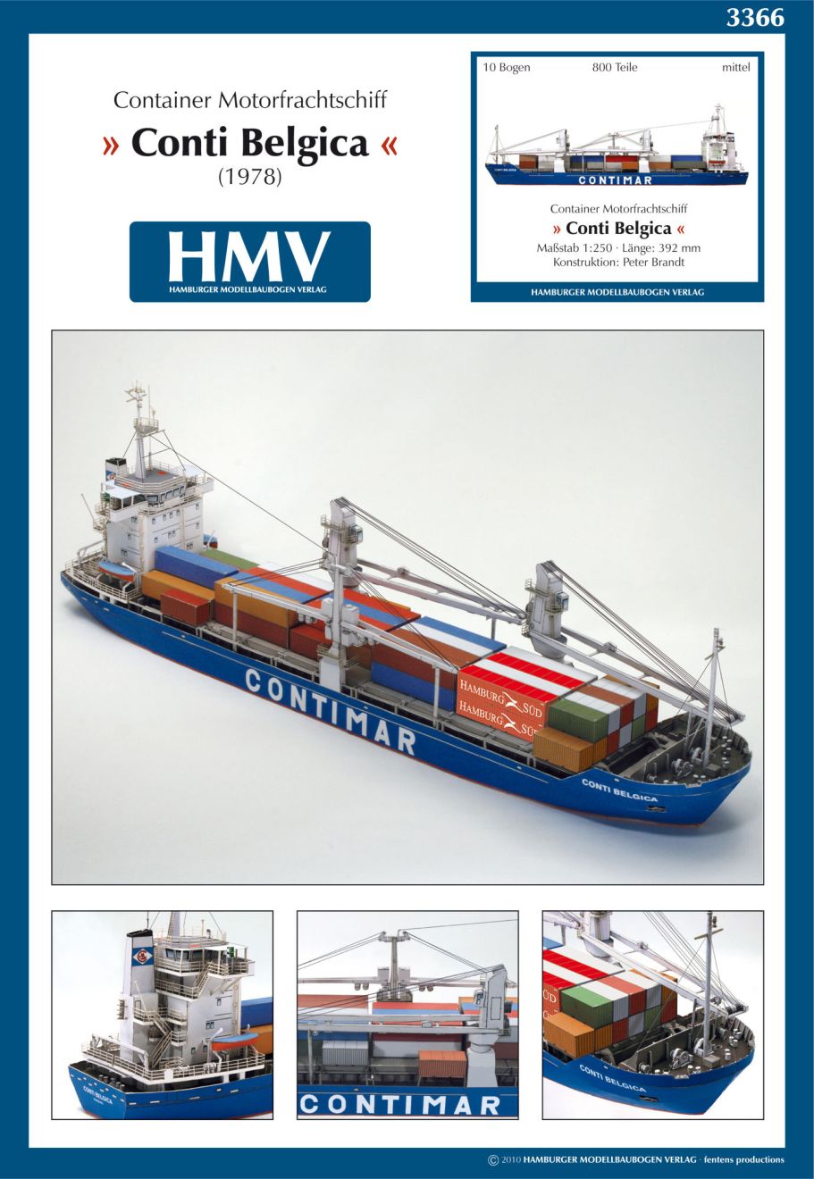 Mit den Containerblöcken, die ebenfalls im Bogen enthalten sind, läßt sich die Conti Belgica sowohl mit beinahe voller Beladung als auch leer darstellen. Auch eine Beladungsszene ist vorstellbar, insbesondere da die CONTI BELGICA ihre eigenen Kräne mit an Bord hatte. Auch eine Beladung mit Schwergut ist denkbar, da die CONTI BELGICA auch für solche Zwecke eingesetzt wurde.