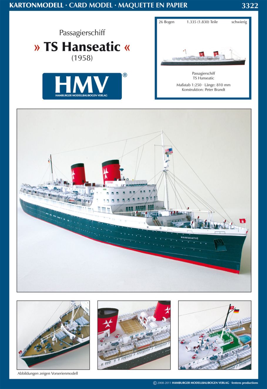 Der Bogen stellt das Schiff mit der wechselvollen Geschichte, in deutschen Diensten im Volksmund auch "Die schöne Hamburgerin" genannt, bei Indienststellung 1958 als "Hanseatic" dar. Als Wasserlinienmodell baubar.