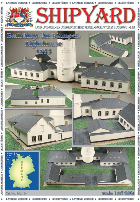 Lasercutmodell der Gebäude zum Leuchtturm Kampen zum selbstbemalen. Alle Teile des Models sind bereits mit Lasercuttechnik ausgeschnitten. Enthält außerdem Folien für die Fenster. Farben für das Bemalen der Teile sind nicht enthalten.