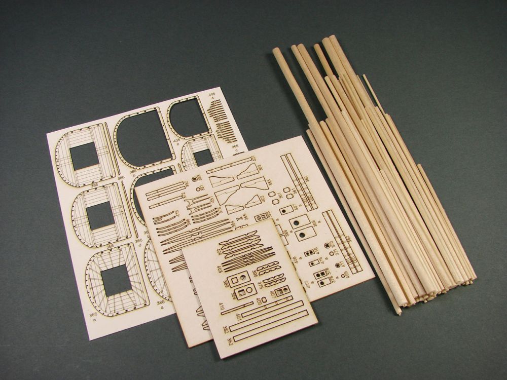 Lasercutsatz und Holzmasten mit verschiedenen Durchmessern für die HMS Mercury von Shipyard.