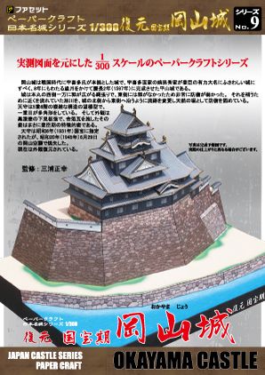 Die architektonische Schönheit dieser Burg ist wunderbar, da sie stark die Azuchi-Momoyama-Kultur erbt und die Designs der Burgen Azuchi und Toyotomis Osaka kombiniert. Die Burg Okayama, die die Entwicklung der japanischen Burgturmarchitektur zeigt, wurde als Papiermodell im Maßstab 1:300 reproduziert.