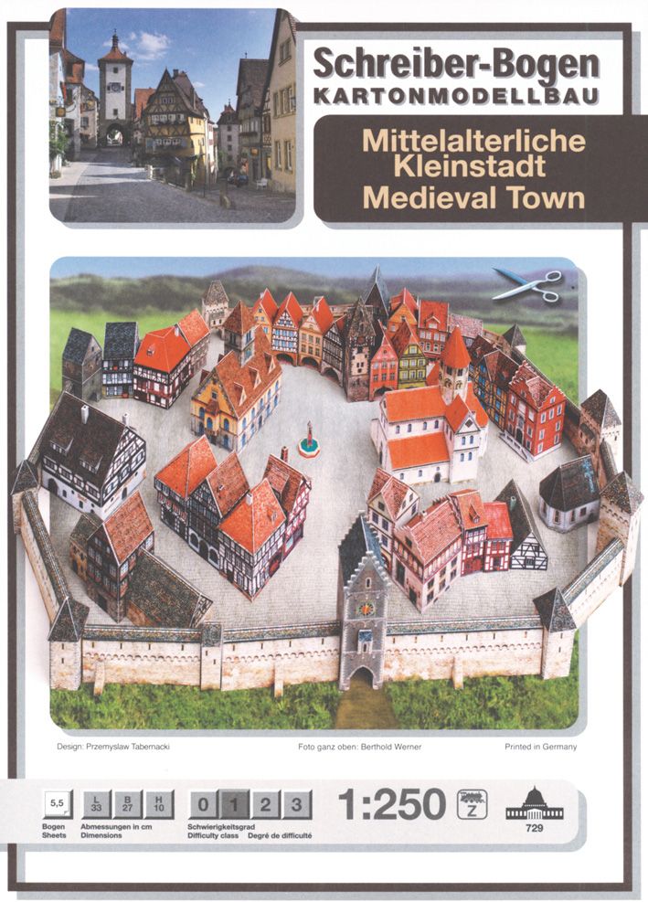 Nach der Idee des gleichnamigen Modells des Konstrukteurs Hubert Siegmund erscheint nun dieser völlig neu entwickelte Schreiber-Bogen. Der Bogen enthält 30 Häuser, ein Rathaus, eine Kirche, einen Brunnen und Stadtmauerteile mit Türmen. Jedes Element lässt sich einzeln ausschneiden und zusammenkleben. Einige Gebäude können zusätzlich mit optionalen Bauteilen ausgestattet werden. Mit diesem Set kann sich jeder eine beliebige kleine Stadtszene zusammenstellen. Es eignet sich auch sehr gut für Modellbahnen in Spur Z.