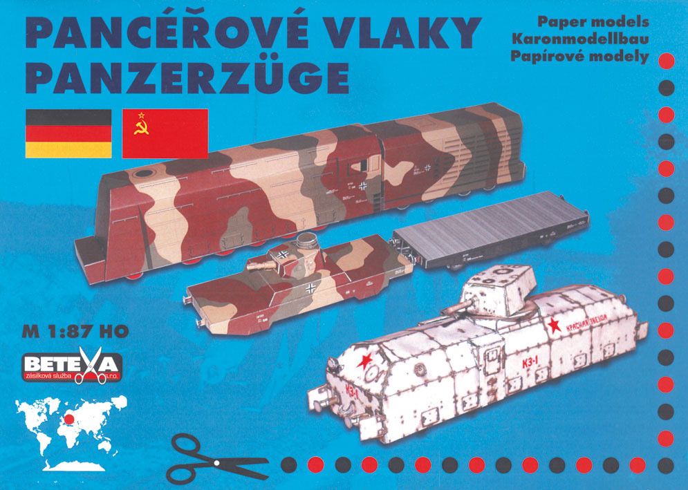 Gepanzerte Lokomotive BP-42 mit Panzerwagen, offenem Güterwagen, Flachwagen mit Jagdpanther und KV-1
