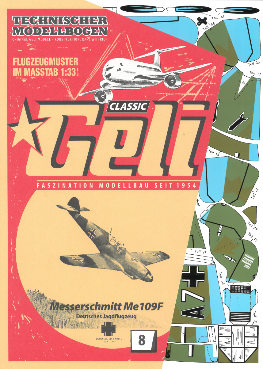 GELI-Originalmodell in traditioneller Produktionsweise hergestellt. Inklusive Zelluloid 7x10 cm für die Cockpitverglasung. Spanten auf 500 g Graufeinkarton gedruckt.