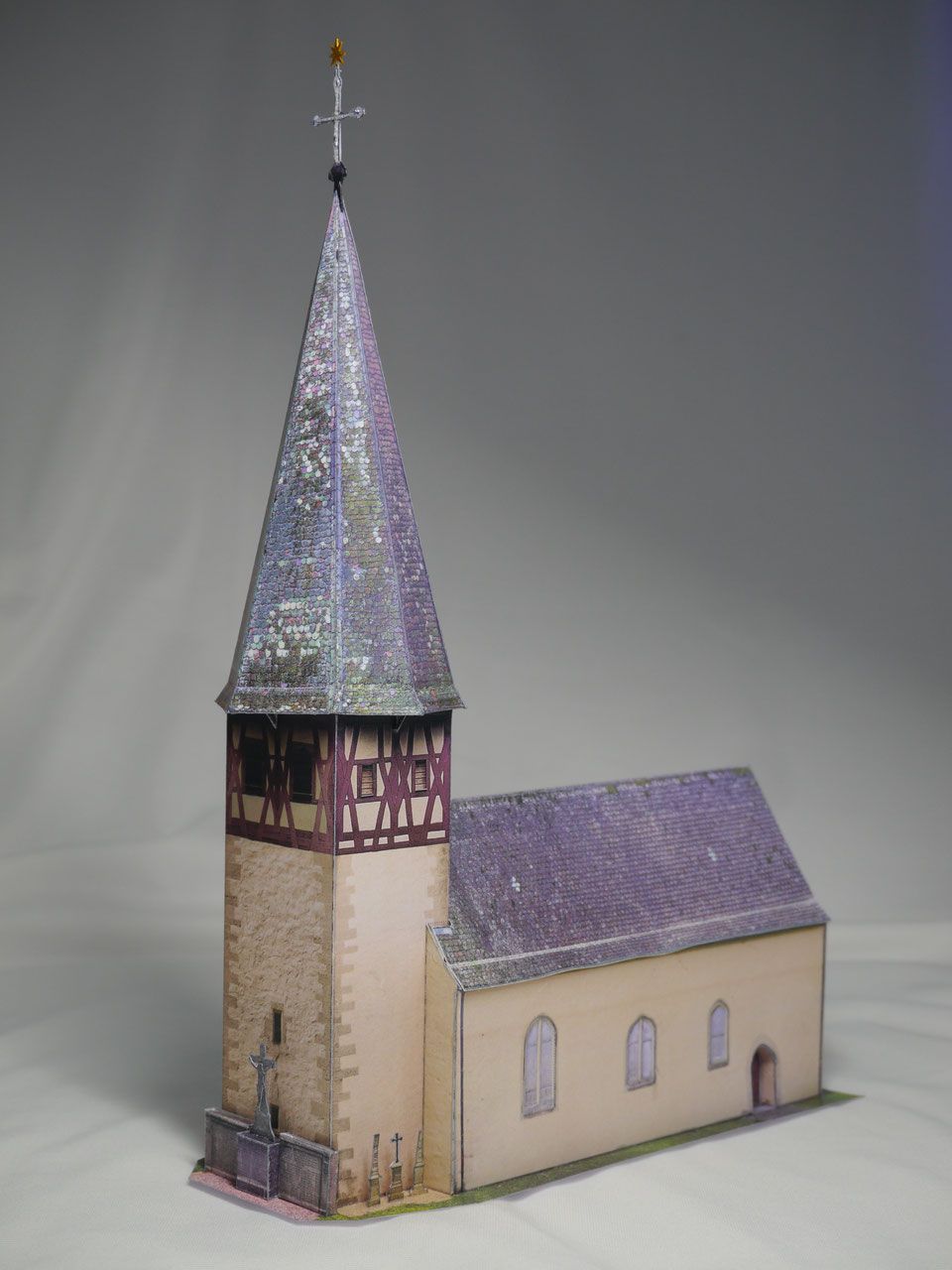 Die St.- Vitus- Kapelle auf dem Friedhof von Haigerloch- Gruol ist im Jahr 1323 entstanden. Nach einer wechselvollen Geschichte wurde sie jüngst umfangreich saniert. Insbesondere der Turm mit seinem charakteristischen steilen Helm und die Glasfenster machen die Kapelle zu einem besonderen Denkmal. Ein schönes Modell für Einsteiger, das alle Grundtechniken des Papiermodellbaues vermittelt. Für H0- Modellbau geeignet!