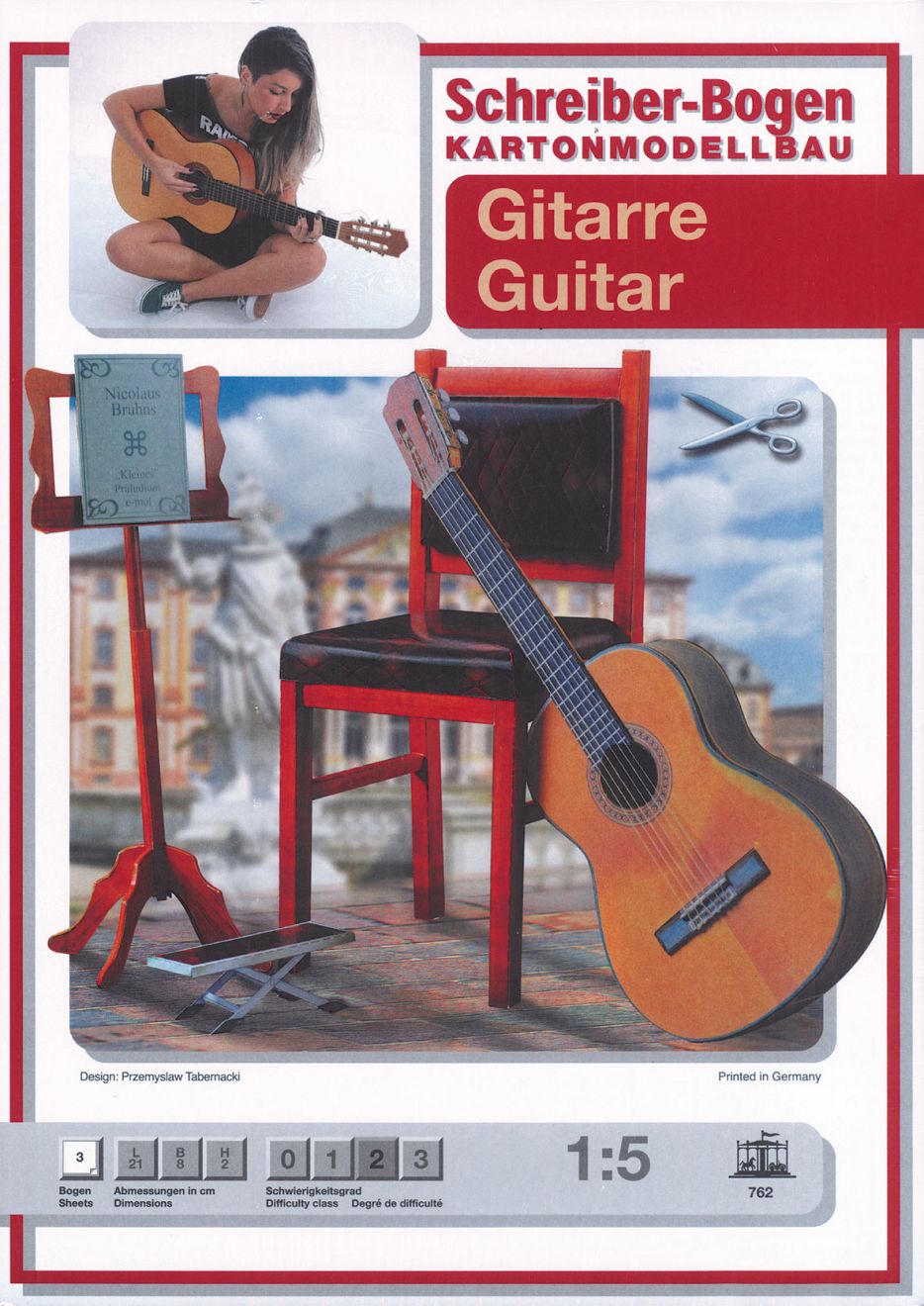 Schönes Modell einer Gitarre im großen Maßstab 1:5. Mit im Bogen sind ein Notenständer, ein Stuhl und die Fußstütze